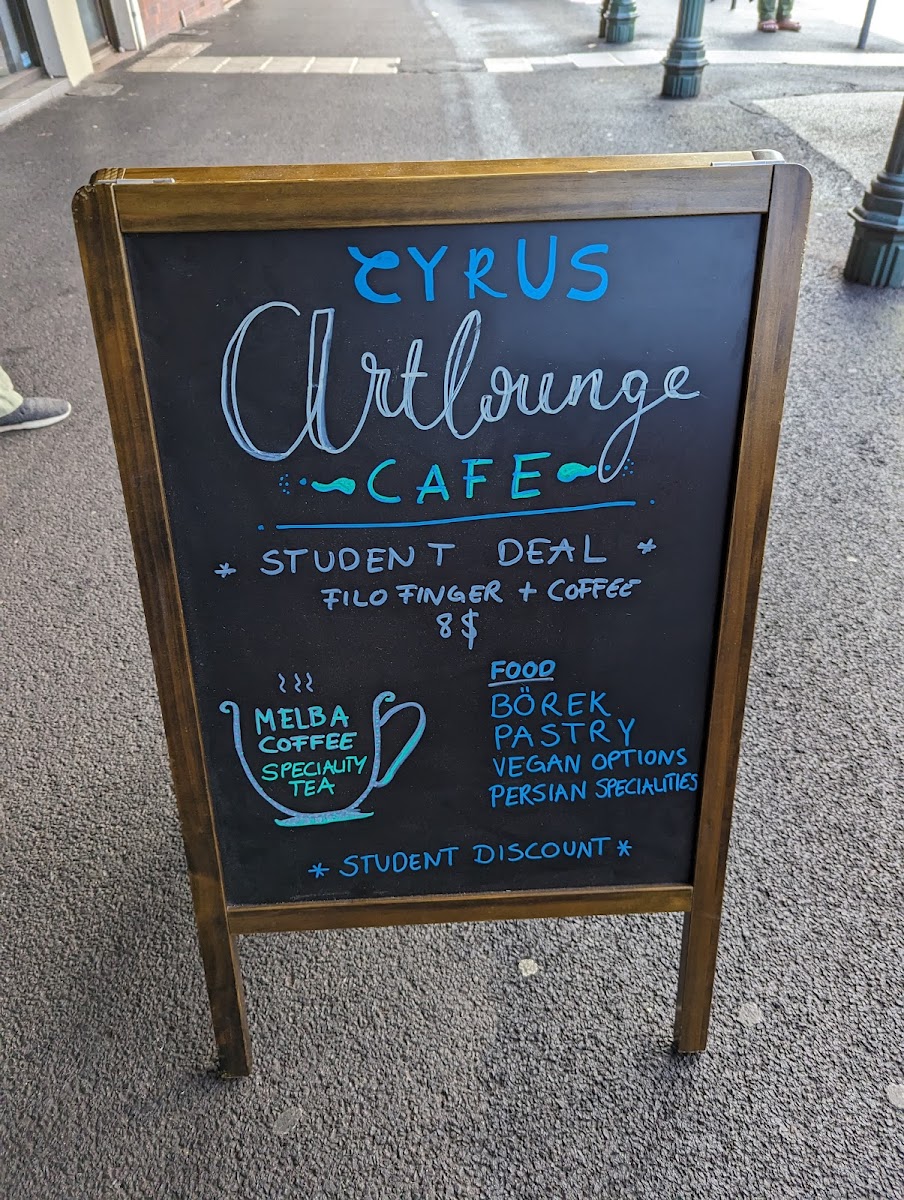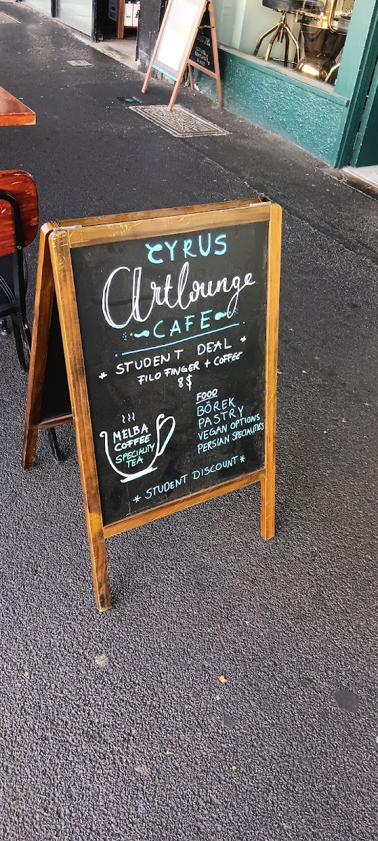 The menu at Cyrus Artlounge offers a delightful blend of both beverages and hearty dishes, each with a unique touch. Starting with the drinks, their selection is particularly impressive. The Black Tea, served from the home blend 'Art Lounge' recipe, offers a rich and fragrant taste, a nod to Cyrus's grandmother's legacy. For coffee lovers, options like the smooth Flat White and the indulgent Mocha stand out, catering to a variety of preferences. For those who enjoy a lighter, more frothy coffee, the Oat Cappuccino is a standout, offering a creamy texture without the dairy. Additionally, if you're in need of a quick caffeine boost, the Takeaway Latte is available, perfect for those on the go.